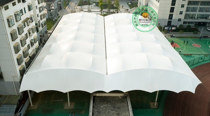 燁興-桐梓一中運動場鋼膜結(jié)構(gòu)球場雨棚工程是政府專項撥款項目,膜結(jié)構(gòu)工程面積2850平米,兩個標(biāo)準(zhǔn)籃球場和四個標(biāo)準(zhǔn)羽毛球場以及相關(guān)觀賽區(qū)域被納入膜結(jié)構(gòu)的遮蓋之下。此工程全部采用進口白色杜肯PVDF膜材,具有良好的透光及防紫外線性能,工程質(zhì)保15年。