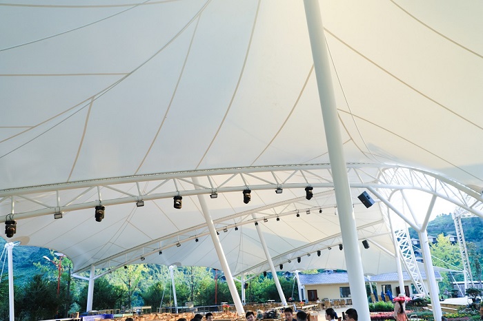 工程概況:梓開元芳草地鄉(xiāng)村月亮場膜結(jié)構(gòu)是由燁興膜結(jié)構(gòu)公司從設(shè)計(jì)、施工、材料等一條龍服務(wù)包干的項(xiàng)目。根據(jù)業(yè)主方要求,項(xiàng)目建成后,在特定時(shí)間將作為大型活動(dòng)的開、閉幕會(huì)場,平時(shí)則作為商業(yè)休閑廣場來運(yùn)行。項(xiàng)目在是在一個(gè)度假景區(qū)的半山腰落地,我們從安全、美觀、實(shí)用性等多方面考慮,它被設(shè)計(jì)成一個(gè)兼具旅游景觀和商業(yè)功用的綜合性膜結(jié)構(gòu)工程。如今工程已經(jīng)竣工并投入運(yùn)行,外觀效果比預(yù)期更美,為度假區(qū)內(nèi)增添了一抹亮色。