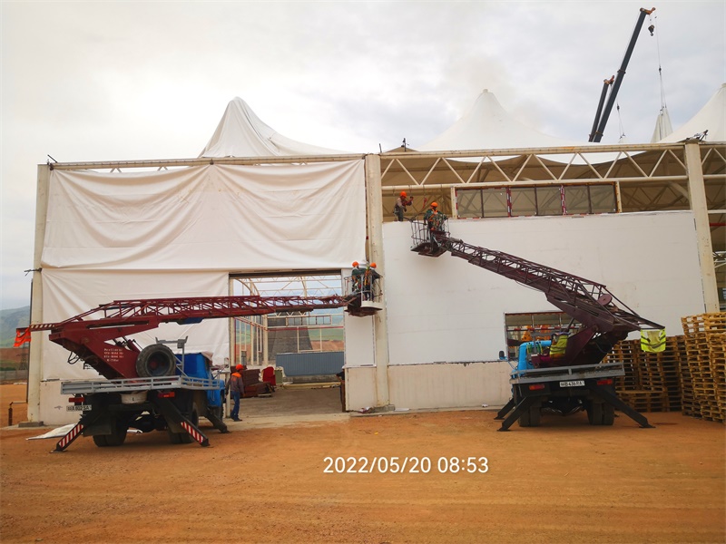 外貿(mào)合作形式:本項(xiàng)目在烏茲別克斯坦·塔什干州·阿漢加蘭落地,在全球疫情影響下,采用了以下合作形式:我們采購(gòu)鋼材、膜材及配套的相關(guān)材料,在國(guó)內(nèi)工廠加工為成品部件后打包運(yùn)輸?shù)絿?guó)外場(chǎng)地;業(yè)主在當(dāng)?shù)卣夜と藞F(tuán)隊(duì),我們派遣資深的鋼結(jié)構(gòu)和膜結(jié)構(gòu)技術(shù)人員到現(xiàn)場(chǎng)培訓(xùn)并指導(dǎo)工人施工安裝,直至項(xiàng)目順利完工。