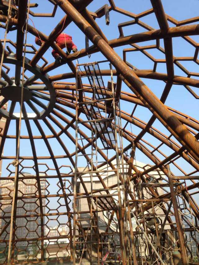 專業(yè)防銹加工處理:深圳燁興的每一個(gè)工作,其鋼結(jié)構(gòu)部件都要在我們指定的資質(zhì)合格的加工廠進(jìn)行加工成型,然后景觀噴砂打磨以后才按順序上漆防銹。這個(gè)過程比直接在現(xiàn)場(chǎng)加工成型的的鋼結(jié)構(gòu)更加優(yōu)美耐用,防銹效果能達(dá)到5年以上。這個(gè)過程,最是考驗(yàn)企業(yè)良心的時(shí)候,省步驟只做表面工程會(huì)省很多錢,是差價(jià)產(chǎn)生的主要原因。