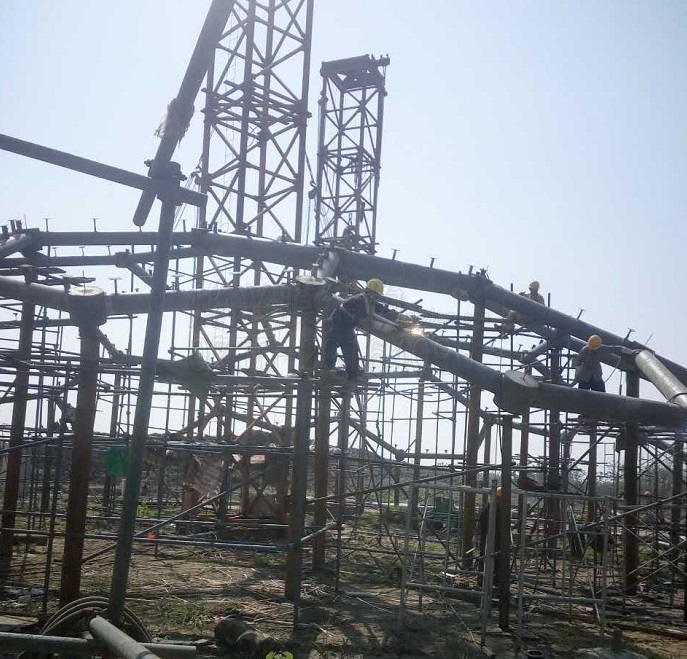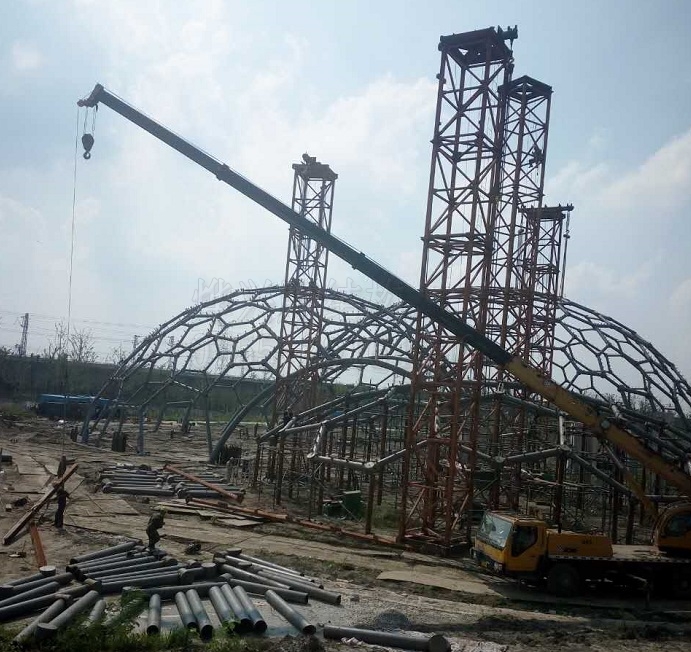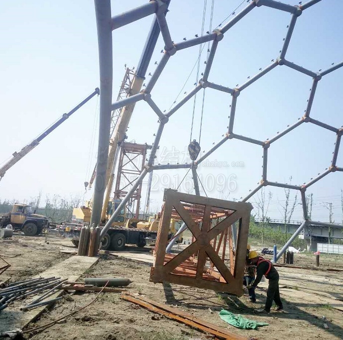 今天的工作任務(wù),主要分兩部分,主力繼續(xù)對(duì)三號(hào)球的鋼構(gòu)進(jìn)行地面拼裝,剩余一隊(duì)人員負(fù)責(zé)對(duì)二號(hào)球鋼構(gòu)的支撐架進(jìn)行拆解轉(zhuǎn)移,為三號(hào)球鋼構(gòu)吊裝做好準(zhǔn)備。連云港薔薇湖熱帶植物園一期工程三個(gè)半球形場館,目前已經(jīng)完成兩個(gè)半球的鋼構(gòu)完成拼裝,第三個(gè)已在地面完成三分之一量,即將準(zhǔn)備吊裝。