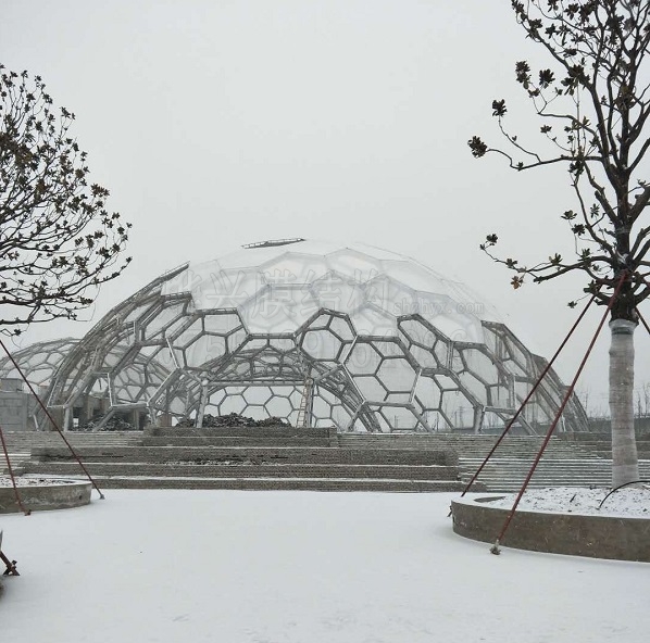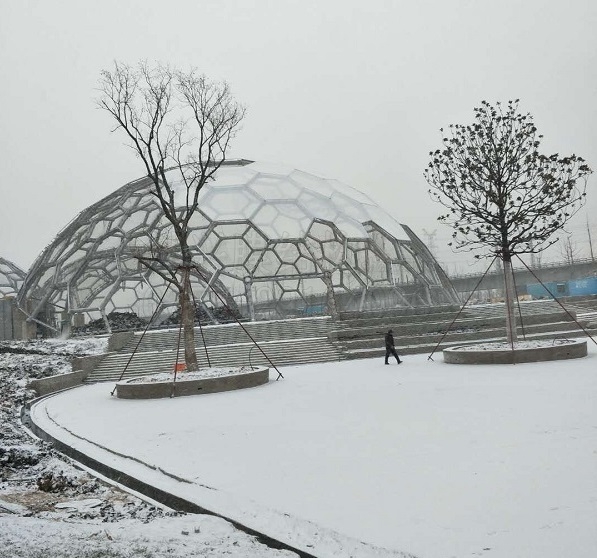 往日里熱鬧的ETFE熱帶植物園項目工地已經(jīng)安靜下來,遠(yuǎn)遠(yuǎn)望去,三個巨大的鋼結(jié)構(gòu)半球靜靜倒扣在冰天雪地中,已經(jīng)開始裝膜的1#球頂部雪白,那是新裝的ETFE膜面攔住了積雪。雖未完工,但已經(jīng)顯露出該有的壯觀宏大氣象。