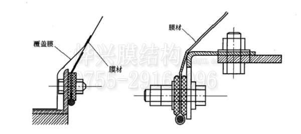 在膜結(jié)構(gòu)建筑中膜材與邊索的連接,常用膜套、束帶、U形件等,根據(jù) 膜材、邊緣曲率、受力大小、預(yù)張力導(dǎo)入機(jī)制等決定。在實(shí)際工程中,主要采用下述三柔性膜邊界節(jié)點(diǎn),并根據(jù) 具體構(gòu)造而適當(dāng)變化。