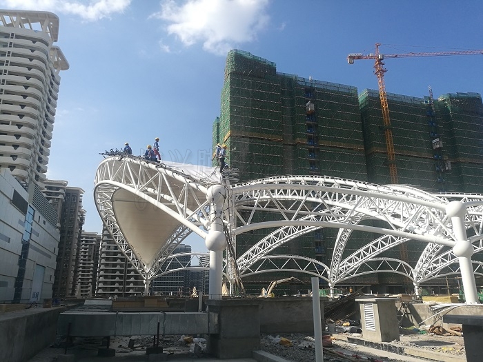海南遠(yuǎn)大廣場3D天幕膜結(jié)構(gòu)項目是典型的商業(yè)廣場建筑,由我們燁興膜結(jié)構(gòu)設(shè)計建造,目前鋼結(jié)構(gòu)已經(jīng)安裝完成,正在進(jìn)行膜布安裝。此工程以純白色為主,粗大而精致的鋼結(jié)構(gòu)骨架撐起接近6000平方米的穹頂天幕,是由兩種高質(zhì)量的膜材按花瓣圖案依次拼接而成。厚重的鋼結(jié)構(gòu)設(shè)計及考慮了海濱城市的抗風(fēng)要素,異種膜材的拼接則讓巨大穹頂在白天時具有視覺上的層次感。