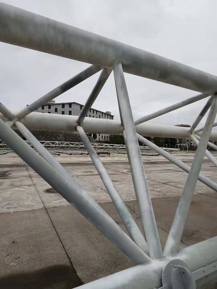 吉安體育場看臺鋼膜結構工程是一個拱高31米,橫跨89米,鋼龍骨架超過100米的單跨式大型體育看臺膜結構。去年進場時,我們運去了一套相貫線切割設備,當時已經(jīng)將主要鋼構部件加工完成,撤場之前已對部分鋼結構龍骨進行拼裝焊接。對工程施工而言,最忌諱的就是工程中途長時間停工,鋼膜結構工程也是這樣,不做成成品,自然天氣就能對現(xiàn)場的各種原材料造成巨大傷害,如鋼構銹蝕。作為一家有經(jīng)驗有良心的公司,雖然是匆忙撤場,但我們還是堅持把所有鋼構部件進行了一次防銹噴漆處理。